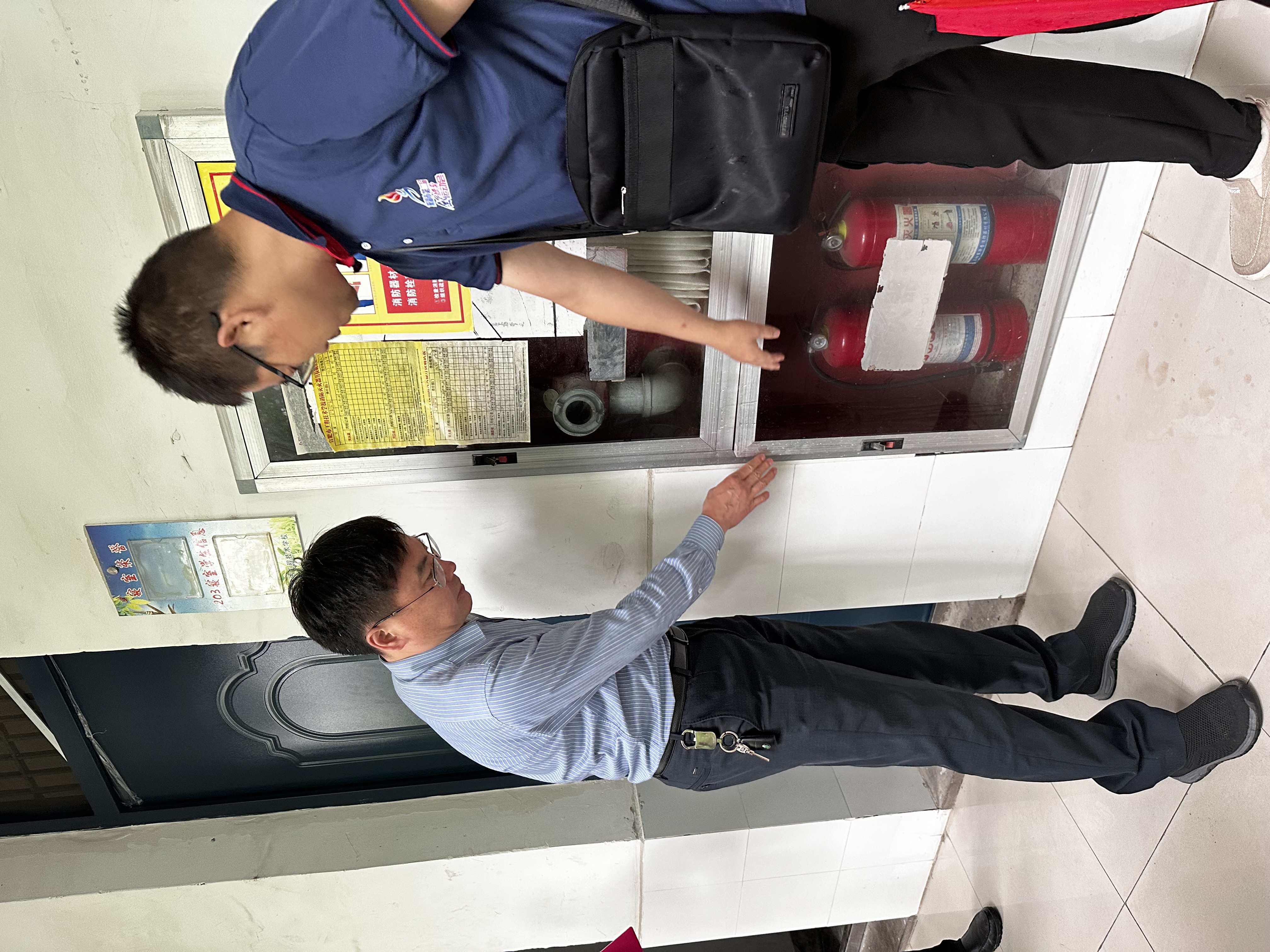 检查组在听取汇报和查阅相关台账资料后,立刻深入学校教学楼、实训楼、图书馆、食堂、学生宿舍等教育教学和生活场所,对疏散通道、疏散指示标志、应急照明、消防栓、灭火器、电器电路设备等情况进行检查。张艺国一行在检查中,细到查看每一个灭火器的有效期是否有效、每一栋楼层的消防栓是否正常出水、每一张消防设施的检查记录是否规范、每一块疏散指示标志是否清楚、每一处疏散通道是否畅通、每一处电器电路设备是否老化,每一间宿舍是否有安全逃生口。
