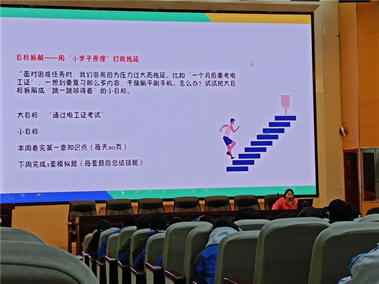 在谈及“新学期,用目标为成长赋能”时,李老师通过列举掌握专业技能、坚持运动、每天背10个单词等短期目标,以及考取证书、规划升学就业等长期目标,为同学们指明方向。她提醒大家目标要具体可行,并鼓励从每天的微行动做起,让同学们认识到点滴努力的重要性。此外。李老师分享了实用的减压方法,如通过运动、写日记来释放情绪,用行动代替焦虑,善用学校资源寻求帮助等,让同学们掌握应对压力的有效策略。