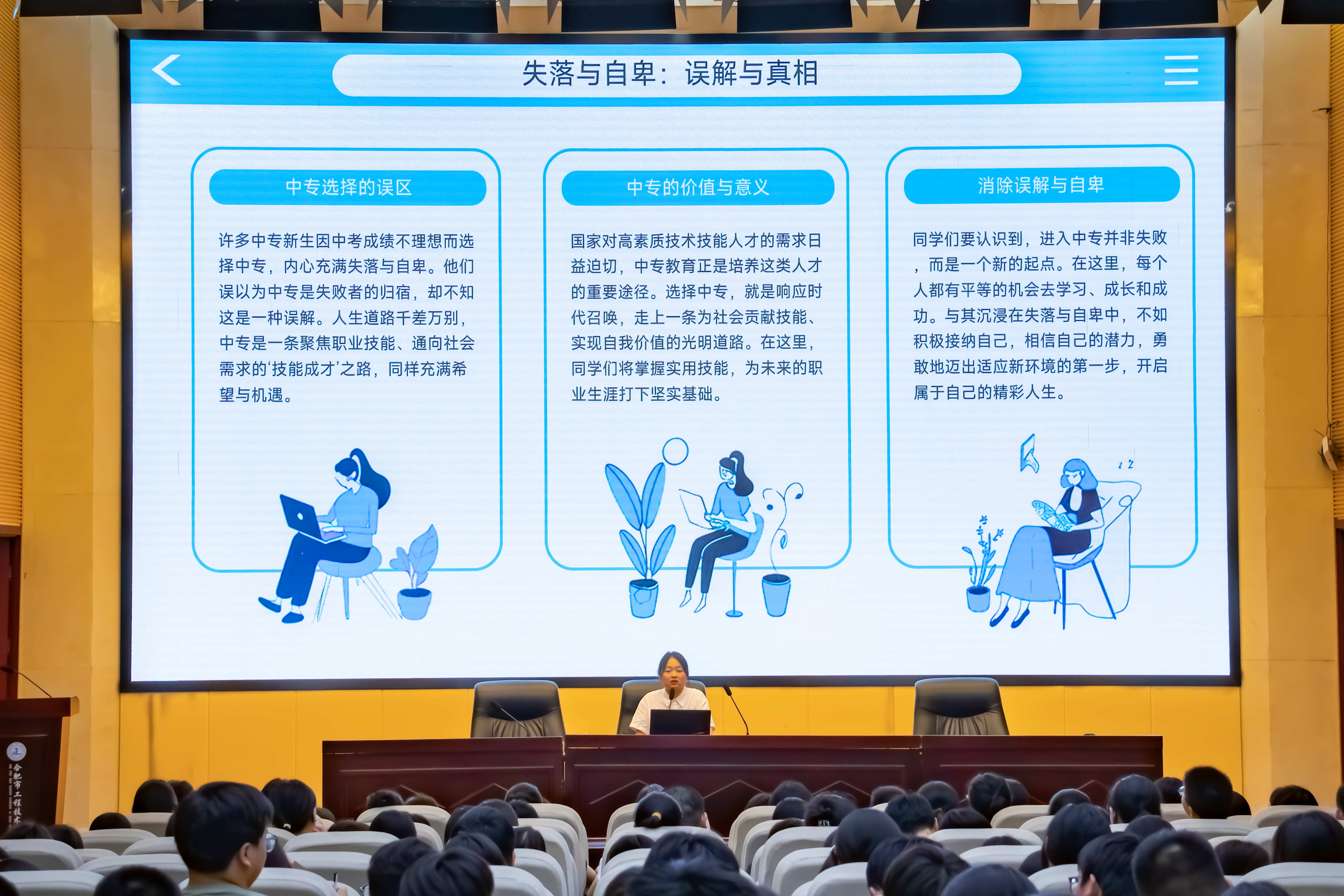 讲座伊始,新生可能普遍存在的心理困扰。破除“失落与自卑”,重拾自信。部分新生因中考成绩而产生的“失败者”误区,选择中专是响应国家培养高素质技术技能人才的时代召唤,是走上一条“技能成才”、“匠心报国”的光明大道。认识到这是一个崭新的、平等的起点,应接纳自我,相信潜力,将过去的失落转化为未来专注技能学习的动力。 “陌生与孤独” “迷茫与空虚”,是寻找方。,目标缺失是迷茫感的来源。接纳这一过渡期的正常心理反应,同时积极通过参加社团、与师长交流等方式探索职业前景,逐步设定清晰的学习与成长目标,用充实的生活驱散空虚,找到属于自己的航向。
