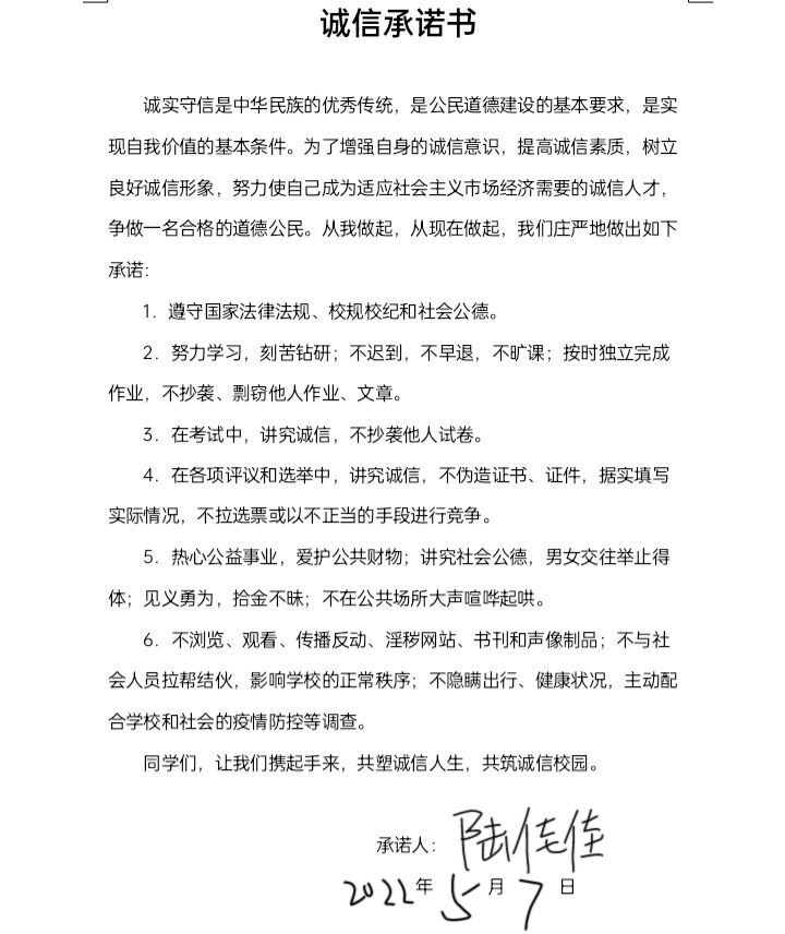 部分诚信承诺书签名
