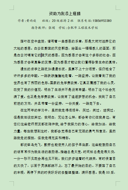 3、线上“助学筑梦铸人”资助征文活动,20级和21级报来的征文中有47篇征文,经认真评选:21级计算机1班童雯妍同学“助学筑梦铸人”和20级旅游2班黄雨旋同学“资助为我添上翅膀”两篇推荐上报。