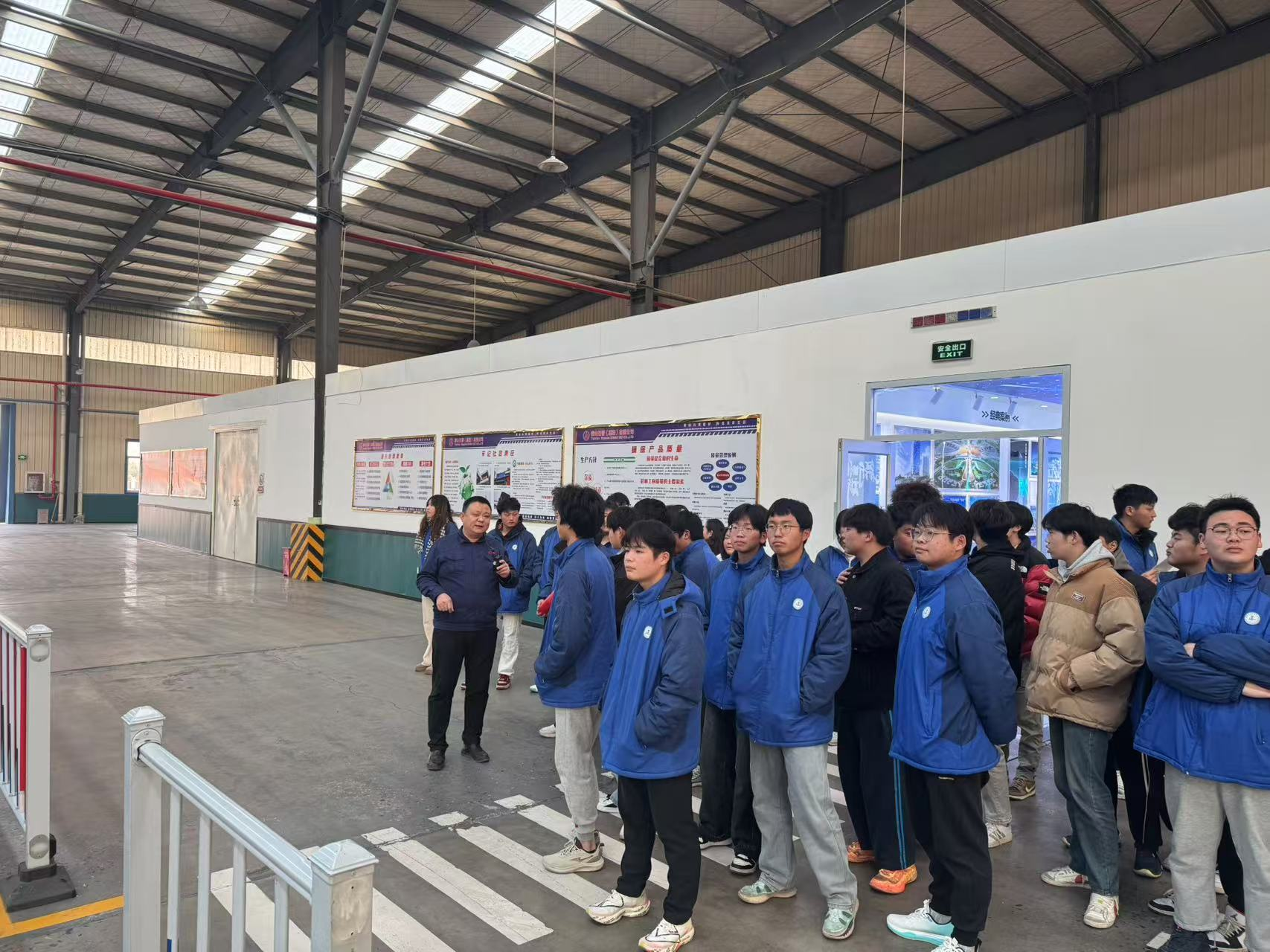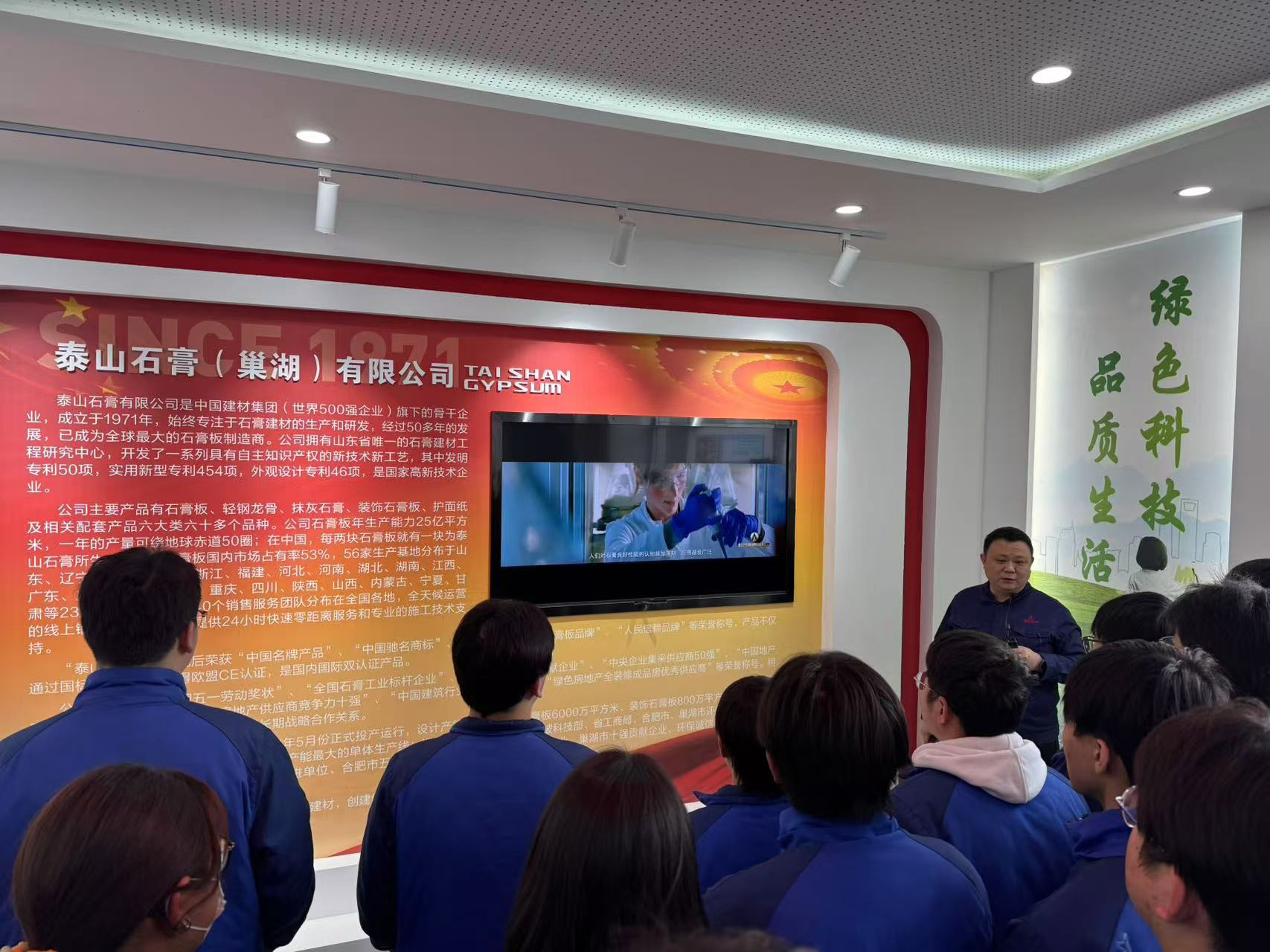 师生们首先来到泰山石膏(巢湖)有限公司,泰山石膏有限公司是世界500强中国建材集团旗下的骨干企业,专注于石膏建材的生产与研发,属于国家高新技术企业。在公司的展览馆中,大家通过观看宣传视频了解了企业的基本概况,并参观了公司主营产品的展示区和生产车间。公司综合处处长徐亮详细向大家介绍产品的特点和用途,石膏建材产品先进的新工艺技术和良好的市场效应,引得同学们啧啧称赞。参观完毕,同学们纷纷表示,作为新时代的中职学生,一定要紧跟时代步伐,努力学习新知识、掌握新技能,勇于创新,敢于突破,为推动经济社会发展注入新的动力。