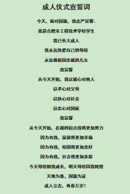 希望同学们永远记住这一天、这一刻——我长大成人了,成为一个对自己负责,胸怀家国的成年人!同学们的人生也翻开了崭新的一页!愿十八岁的合工校学子心怀感恩、铭记责任,逐梦前行!