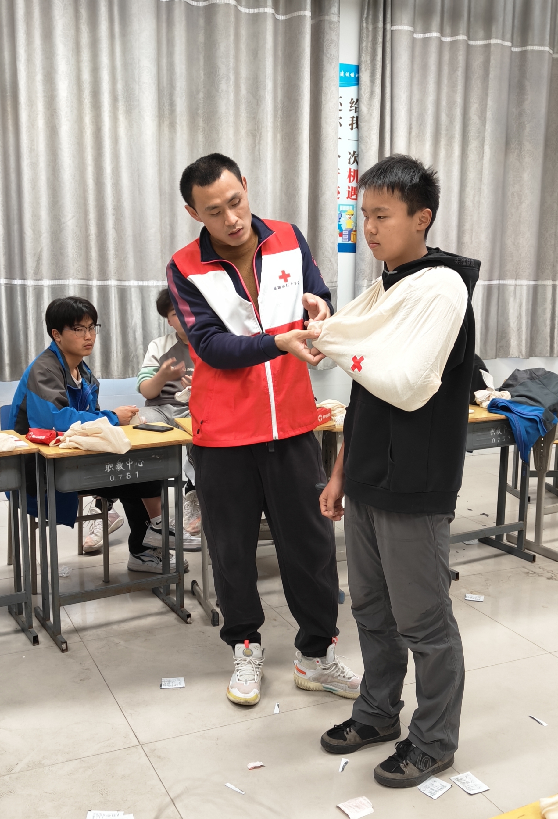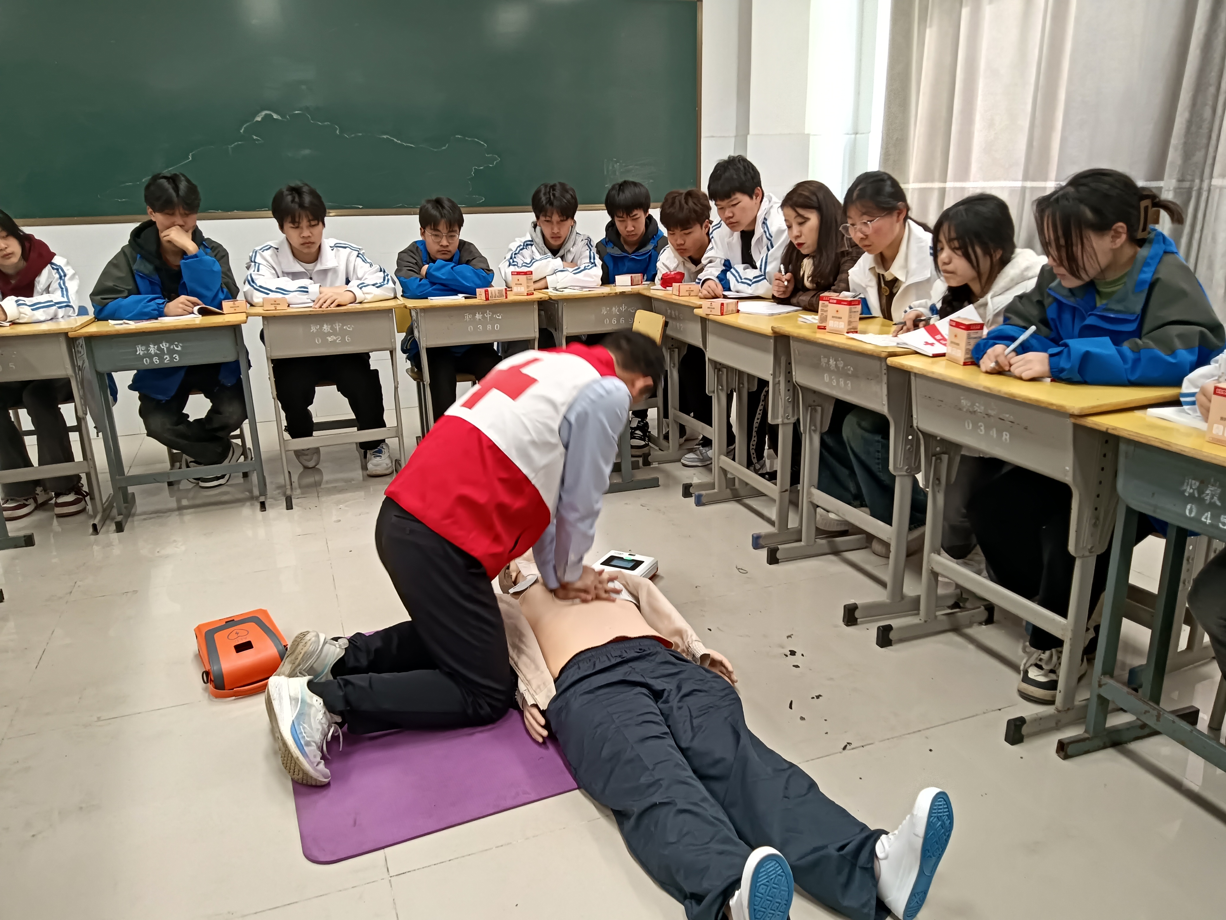 经过前一阶段的线上学习,各班的安全联络员已经了解了红十字运动的概况、现场救援的相关知识,基本掌握了心肺复苏、气道异物梗阻、创伤救护的技能技巧,并顺利通过了理论考试。本次培训和考核包括心肺复苏操作、AED的使用和创伤救护等急救技术。