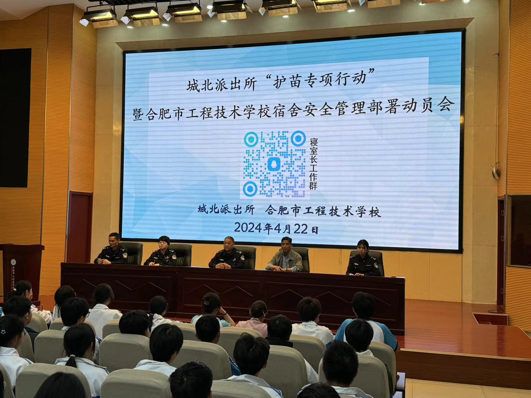 4月22日晚上7点,巢湖市公安局城北派出所走进冰球突破正规网站,联合冰球突破正规网站共同开展“护苗专项行动”暨学校宿舍安全管理部署动员会,教师代表和各班寝室长参加活动,活动由校长潘明主持。