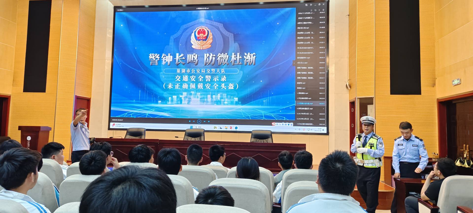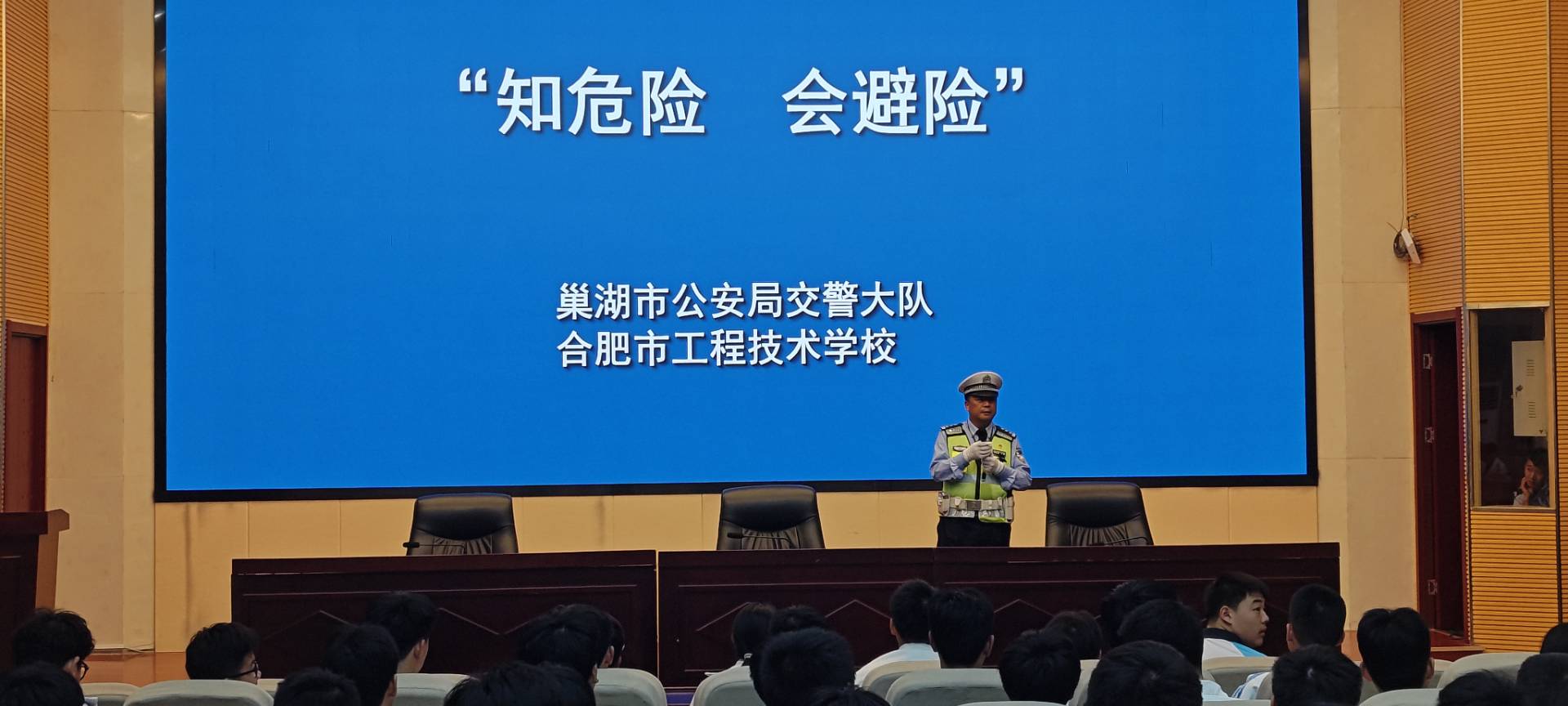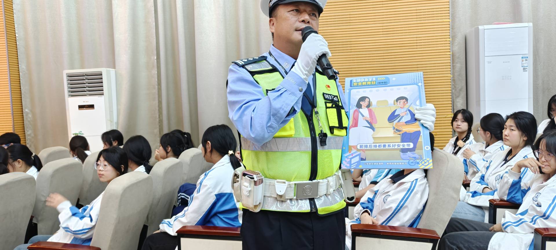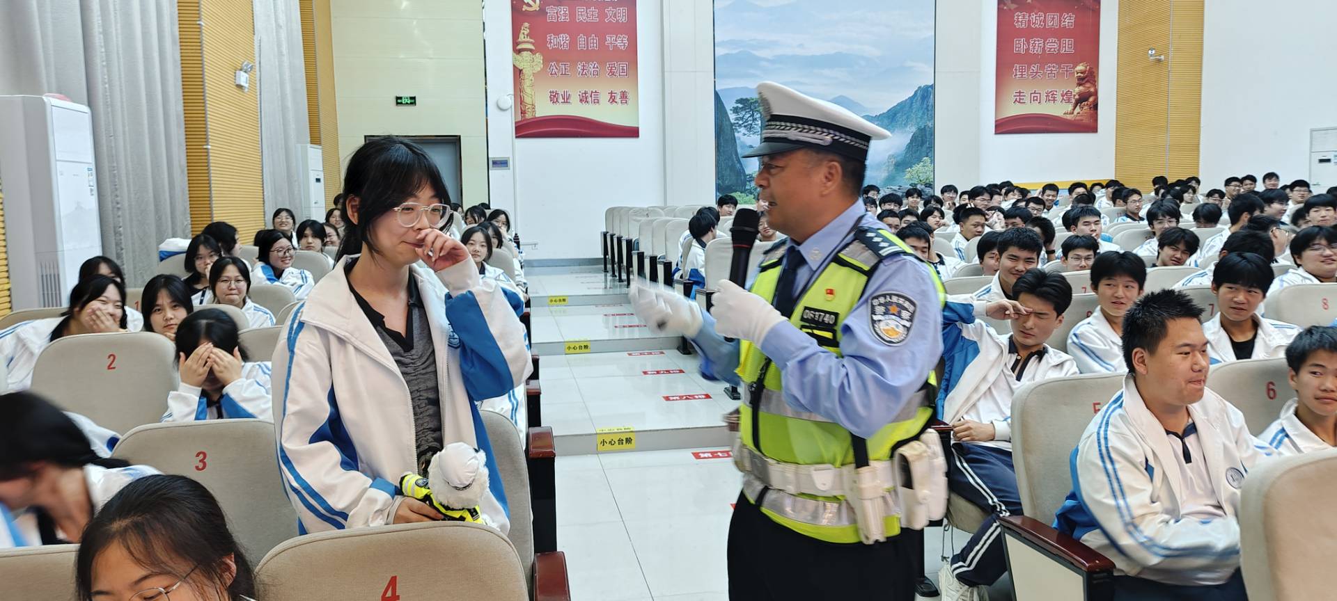 活动开场环节,交警们带着精心准备的宣传资料和教具,走进校多功能报告厅,与学生们进行了面对面的交流。他们结合学生的年龄特点和出行习惯,通过讲解交通安全理论知识、播放交通安全宣传片、进行互动问答等多种形式,向学生们传授了如何安全过马路、正确佩戴安全头盔、遵守交通信号灯等交通安全知识。在互动问答环节,交警给回答正确的学生送去小奖品,鼓励他们积极参与。