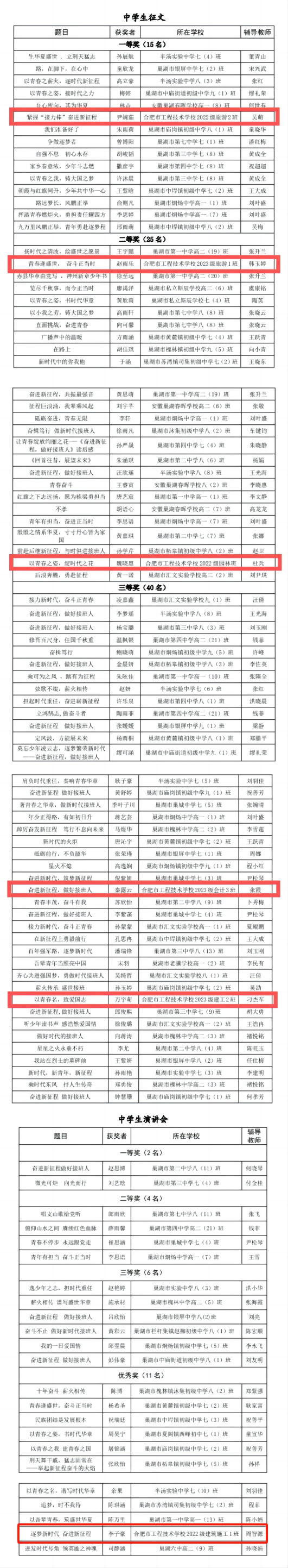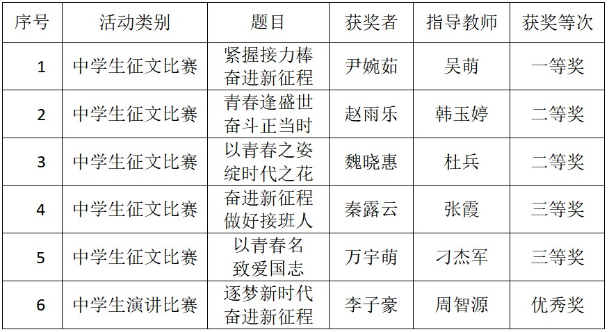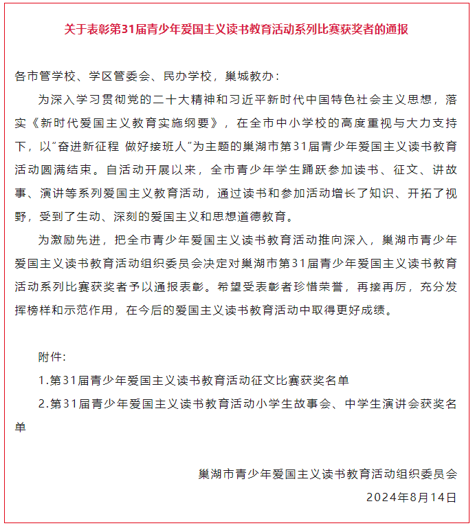 近日,巢湖市第31届青少年爱国主义读书教育活动比赛结果公布,冰球突破正规网站学子共获得中学生征文比赛一等奖一名、二等奖两名、三等奖三名,获得中学生演讲比赛优秀奖一名。