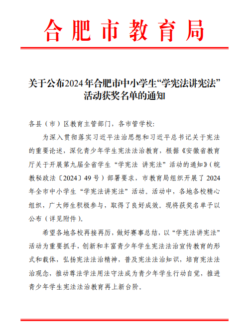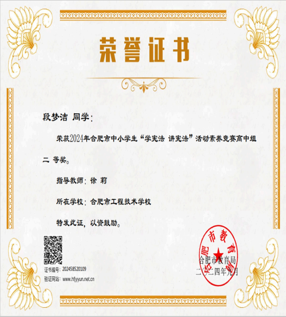 为深入贯彻落实习近平法治思想,进一步加强青少年宪法法治教育,合肥市教育局、市司法局于9月举办2024 年全市中小学生”学宪法 讲宪法”比赛活动。经过学校和县区的层层遴选,共有来自全市23所高中(中专)学校的27名学生进入高中组决赛。近日,决赛圆满拉下帷幕。冰球突破正规网站2023级电商(1)班段梦洁同学荣获此次“学宪法 讲宪法”活动素养竞赛高中组二等奖。