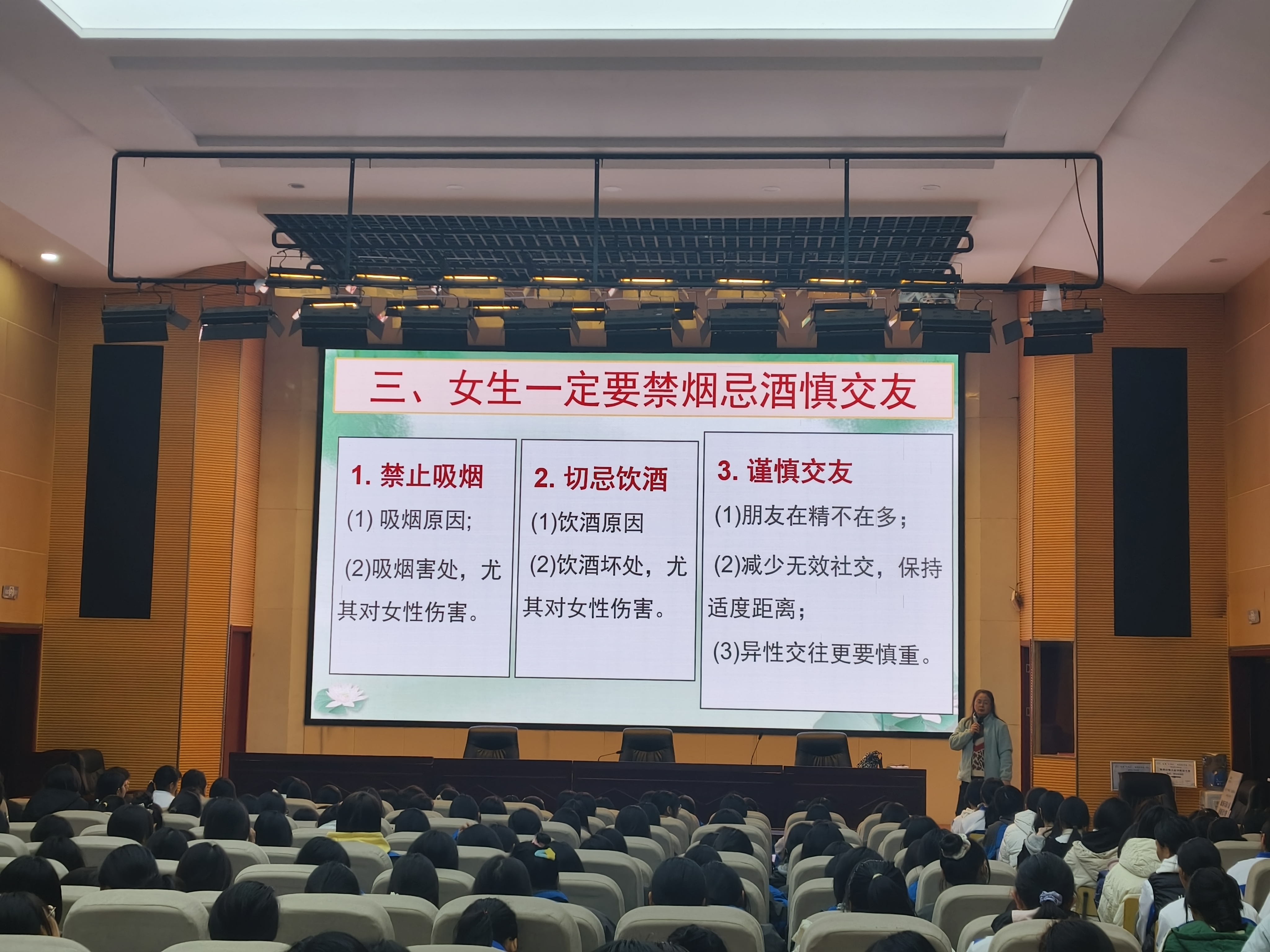 讲座伊始,王老师根据青春期女生的身心特点,以亲切和蔼的态度、科学客观的语言,向正处于青春花季的女生进行细致的讲解和宣传,以鲜活的案例、丰富的经验循序渐进地引出安全知识,通俗易懂地向女生科普了关于青春期生理卫生的相关知识,指导青春期女生要注意个人卫生,保持良好的情绪,正确看待自己的身体变化,让女生对女性生理有了科学的认识,引导同学们正视青春期身体上的一些变化,学会接纳自己、保护自己,做自己身体的主人。同时王老师还围绕女生在青春期可能会遇到的早恋现象、情绪波动和人际关系的敏感性等系列问题,引导同学们认识到早恋对学习和生活的潜在影响,正确识别和处理情绪波动,在人际交往中筑牢健康的边界。