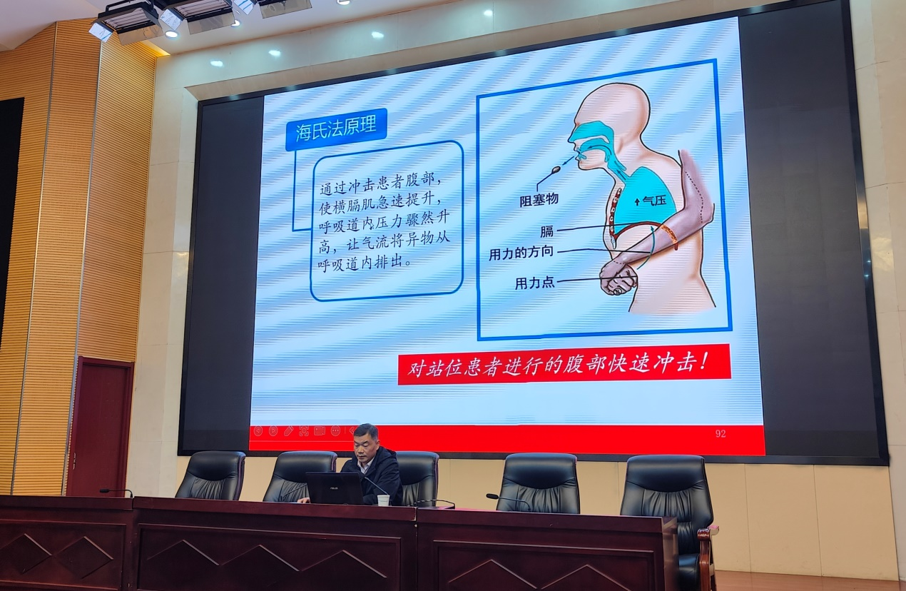 讲座现场,陈老师以通俗易懂的语言、真实鲜活的案例,深入浅出地讲解了心肺复苏(CPR)的操作方法、自动体外除颤器(AED)的使用、海姆立克急救法等应急救护知识和技能。
