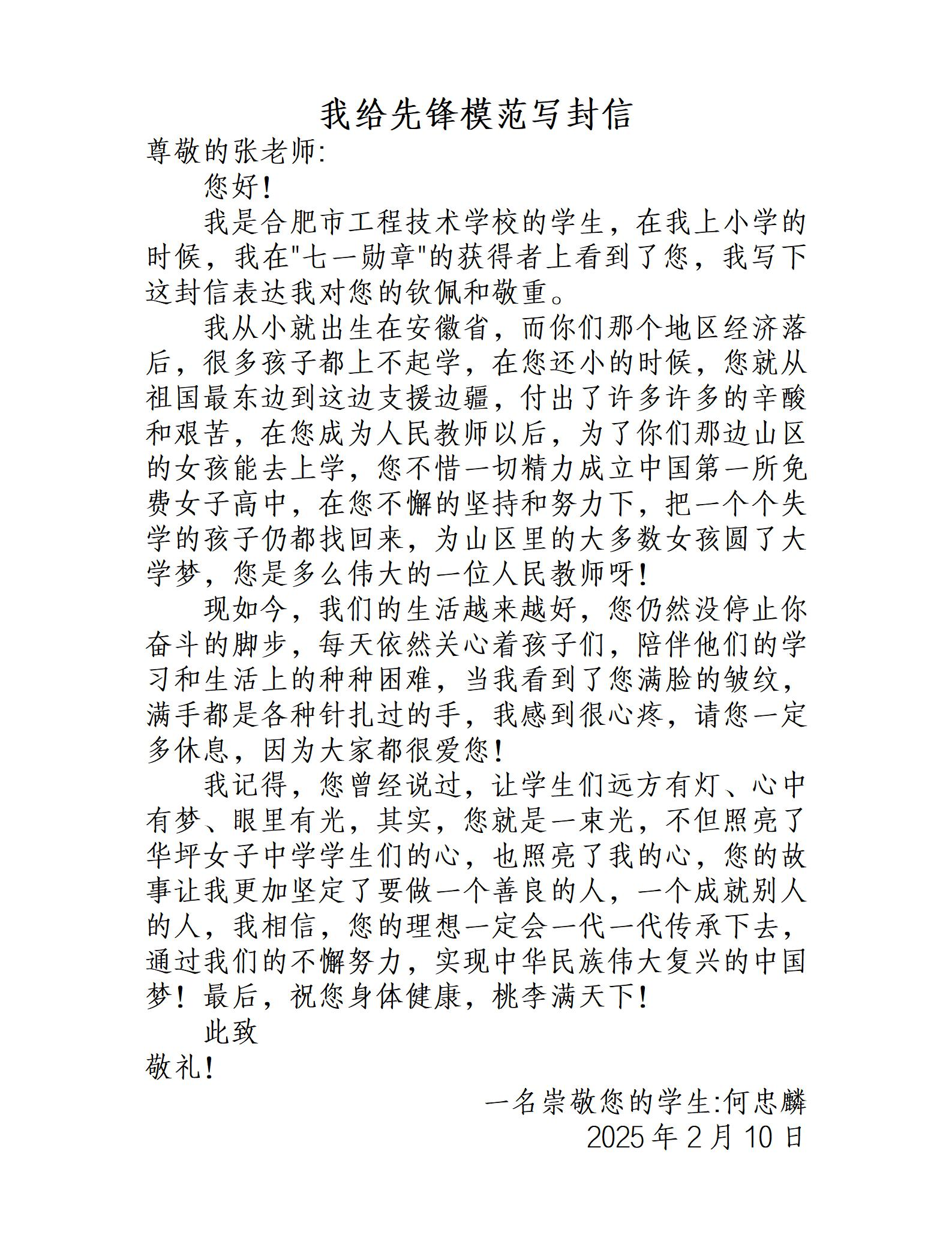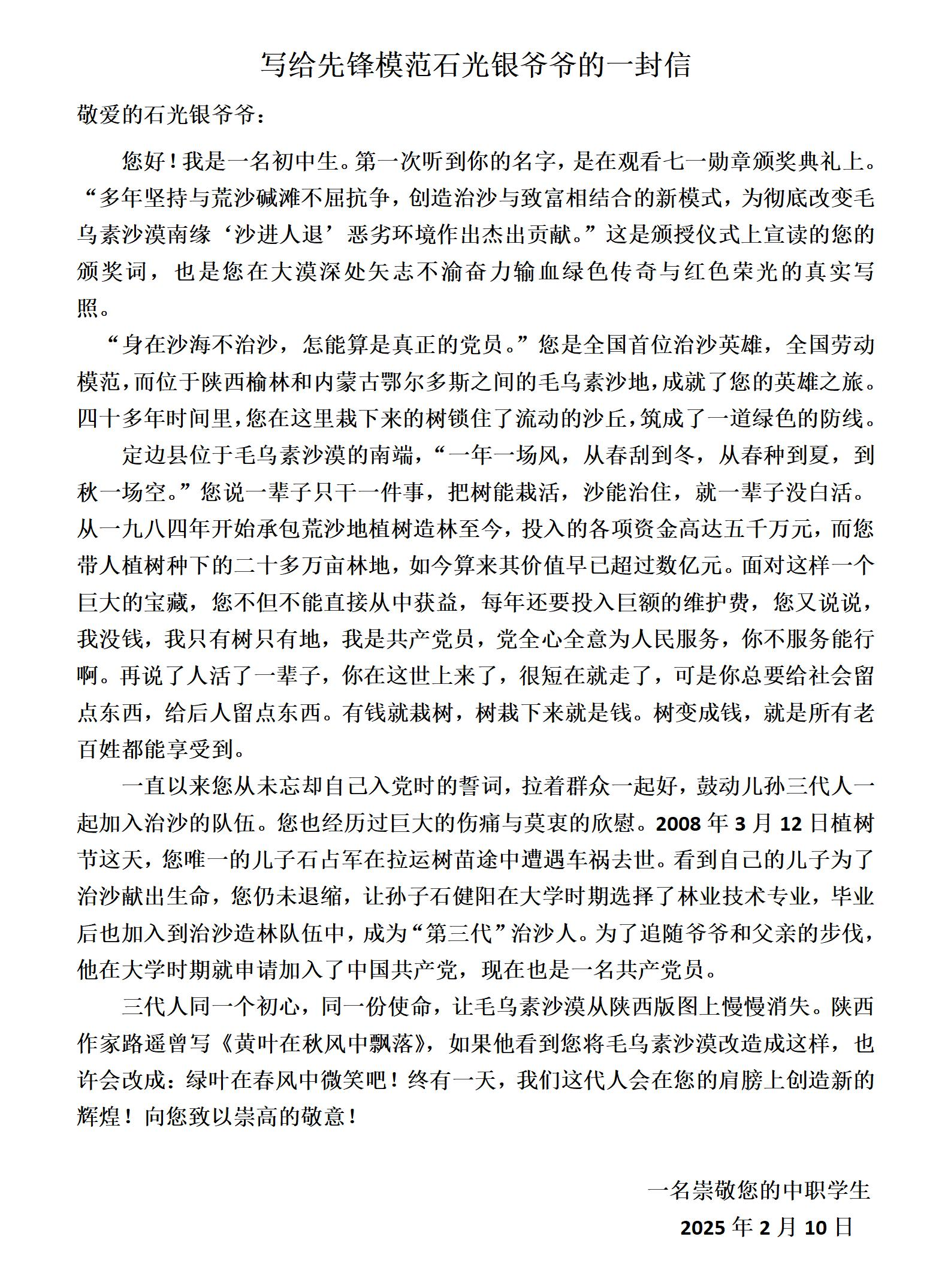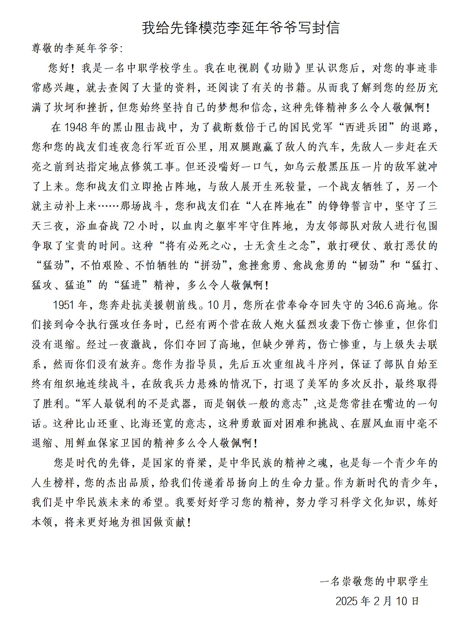 同学们选择一位自己心目中的新时代先锋人物作为写信对象,如“七一勋章”获得者、全国道德模范、航天英雄、科技工作者等,通过网络、书籍、电视等渠道深入了解其事迹和精神内涵。通过写信,激发同学们学习新时代先锋人物的精神品质,树立强烈的社会责任感和使命感。