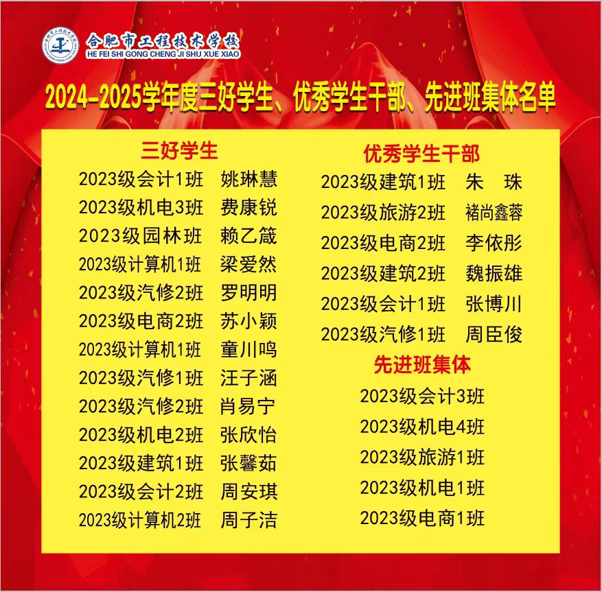 以青春之花,结奋斗之果。榜样,是催人奋进的力量;榜样,是带动集体的先锋;榜样,是正身明心的镜子。合工校学子、集体在“巢湖市中小学2024-2025学年度三好学生、优秀学生干部、先进班集体等评选”中,收获颇丰。