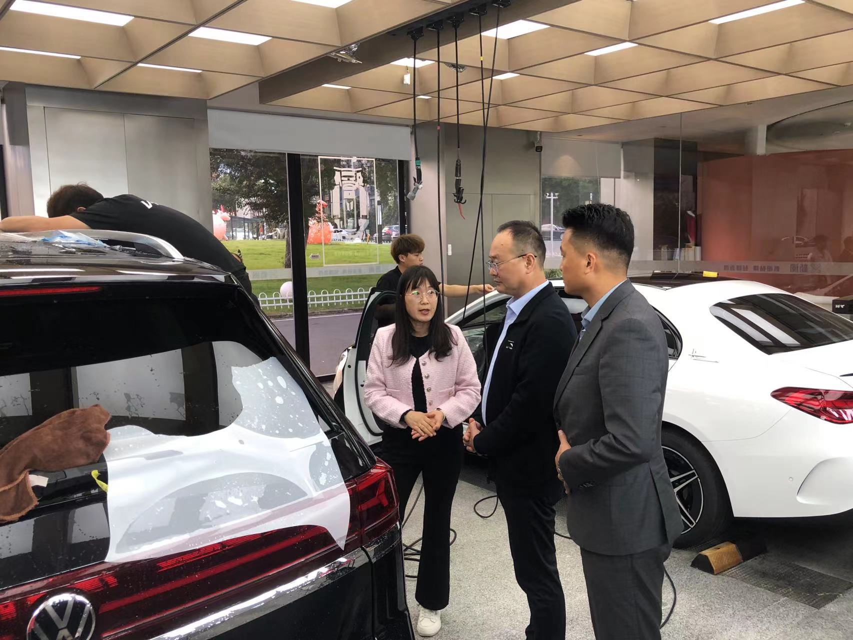 在走访了威固新阅伯乐旗舰店(庐阳店)后,我们深切感受到企业引领行业先锋的创新精神,该店店长向王成满介绍了门店高端车的精洗和贴膜、贴车衣等工艺,学生们在现场细心的给师傅做辅助工作。